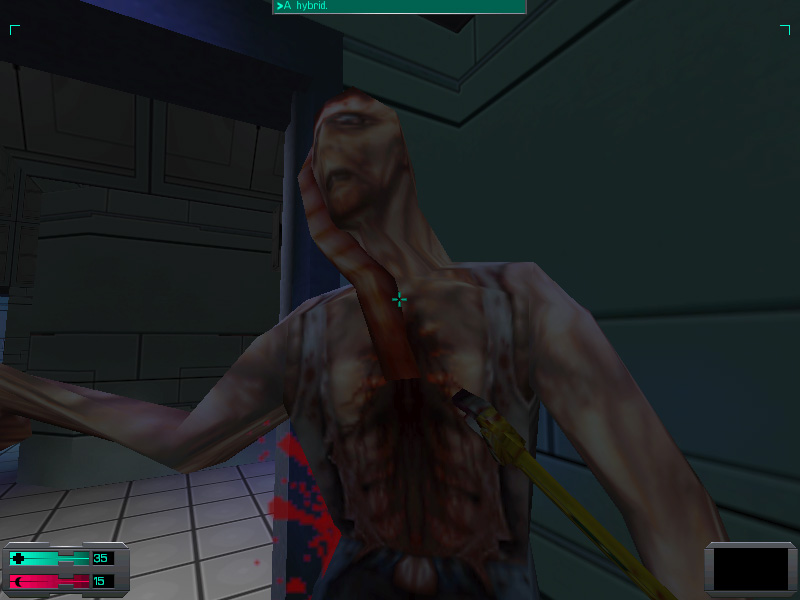 Because System Shock 2 uses the same engine as Thief, it won't surprise you that using the wrench is just like using the sword. That is, it's a right pain in the arse. You have to have the timing exactly right or you'll miss entirely. You can't block with the wrench so you'll have to weave about the place to avoid being dead. It takes two strikes to kill them. Combat is hard.