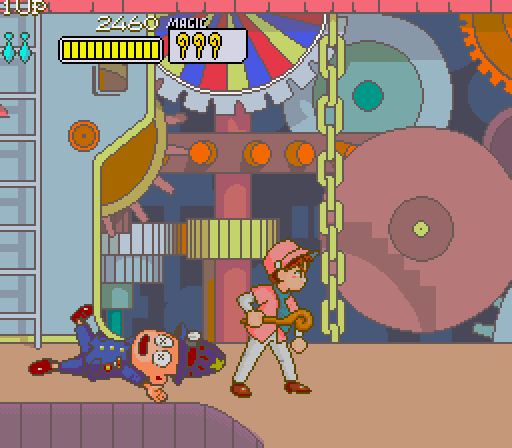 I barely made it out of the guy's house before enemies descended upon the town. Evil boxer robots led by a deranged puppeteer (or maybe the puppet). Fortunately I have my stick to beat them off with.