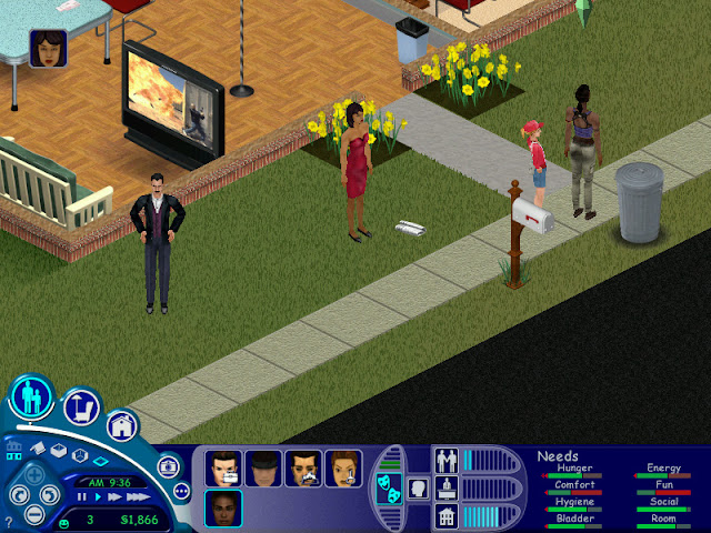 Claude automatically gathered up the plates afterwards and washed them, which helps. Gotta clear them away or else they attract flies and that lowers the room score. Now that they've eaten and cleaned up my Sims' biggest issue is their lack of fun. Not much I can do about that though, as there's no activities like jogging in this that I can send them off doing on their own. I suppose they could take turns reading the paper again.