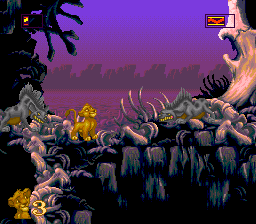 DeleteThe Lion King is actually quite close to the movie to an almost astonishing degree. The music is very recognizably taken from the movie (albeit remixed on occasion), and elements like the Ostrich Ride, the elephant graveyard and so on are taken from the movie as well. (Even the porcupines - not hedgehogs, actually - to some degree, even if they are very prevalent in the game but only feature un a very small scene in the movie). There are only a few elements created solely for the game, but you never quite got far enough here to see them (like another boss fight in the Hakuna Matt's stage, which would've been the next down the line).