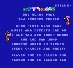 I can change the character's colours, adjust or turn off jumping, disable scene transitions, edit the names, decide if players share their score or are tough dudes, and even put tutorial hints on. There's no option to give me any extra continues, but otherwise it's impressive.
