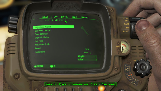 In Fallout 4 the weapon degradation has been removed, so guns stay fresh forever! But I'm still getting guns and improving them over time by boosting my repair skills and combining them with other weapons. The difference is that I'm scrapping the spare guns to get components and then using these pieces to assemble mods. What mods I get to choose from depends on my skills. What this means is that I can take all that junk that I learned to ignore in Fallout 3 and use it to make my stuff better! Though I can't make ammo, weirdly.