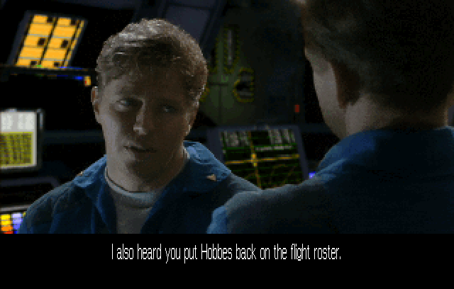 Blair's shuttle lands and he steps out onto the virtual set to meet Captain Eisen and his first officer Ralgha nar Hhallas (aka Hobbes). He's not just the only Kilrathi in Confed, but also the only pilot who wears an XXL-size space helmet. Though it turns out that Hobbes isn't flying these days due to the xenophobia of the other pilots, which really annoys Blair as he was his bro in Wing Commander II.